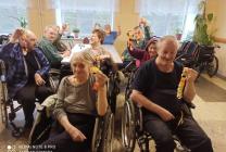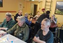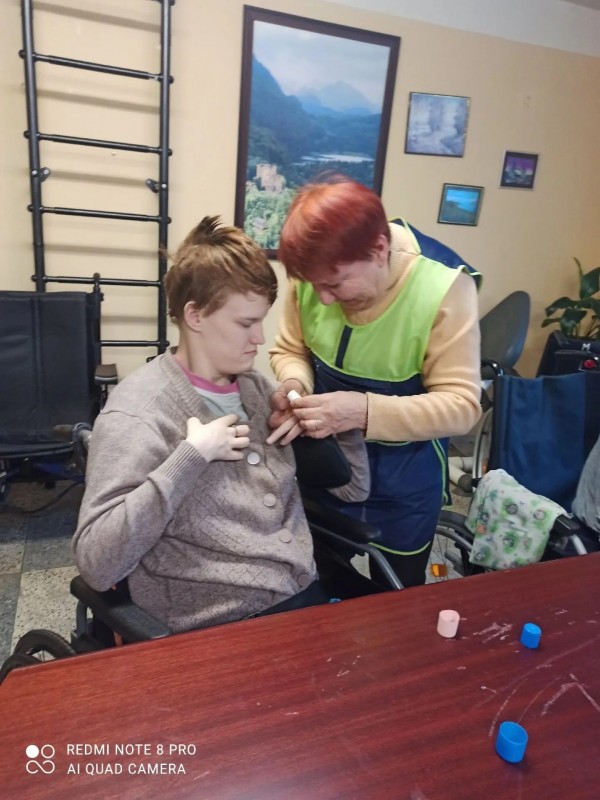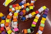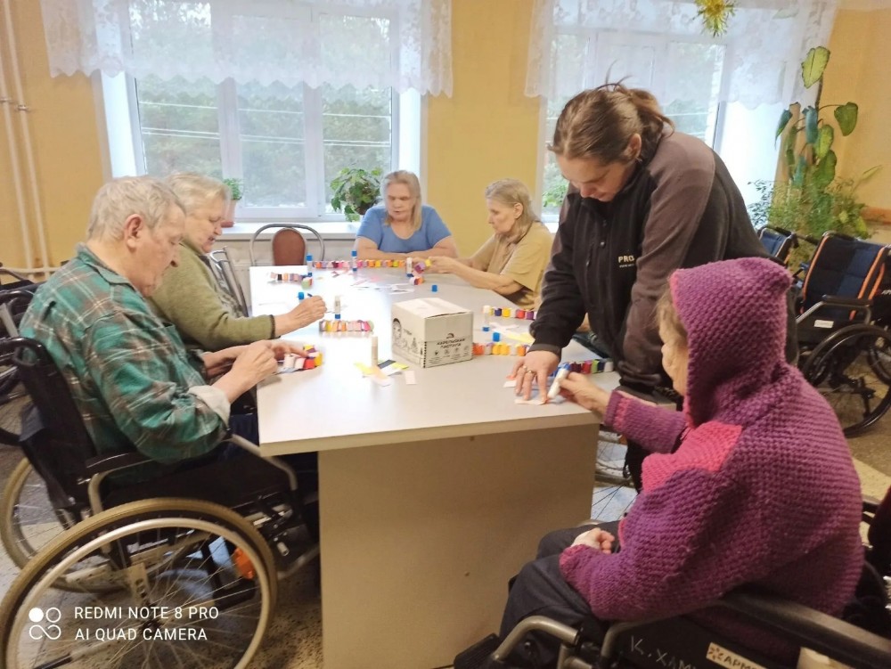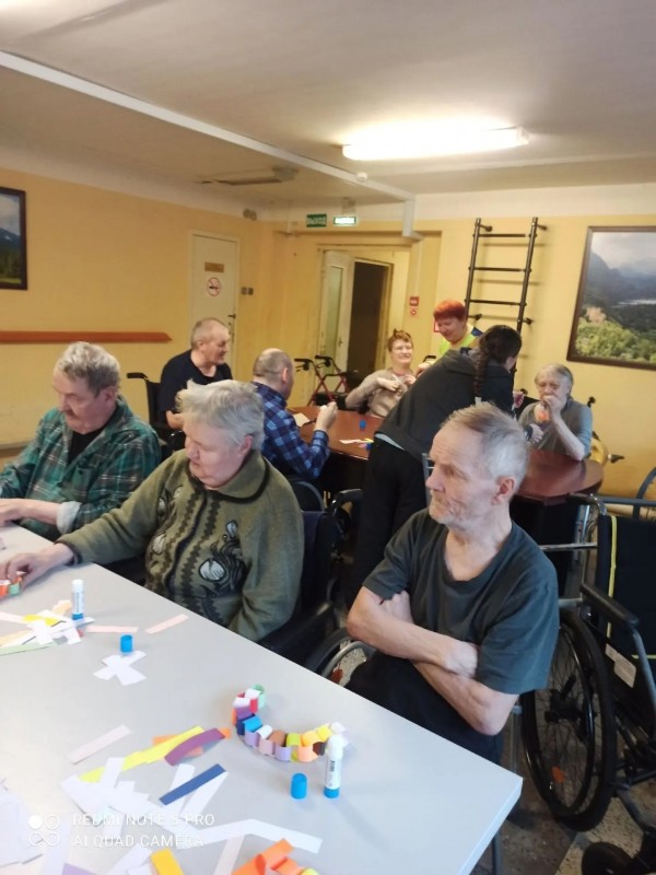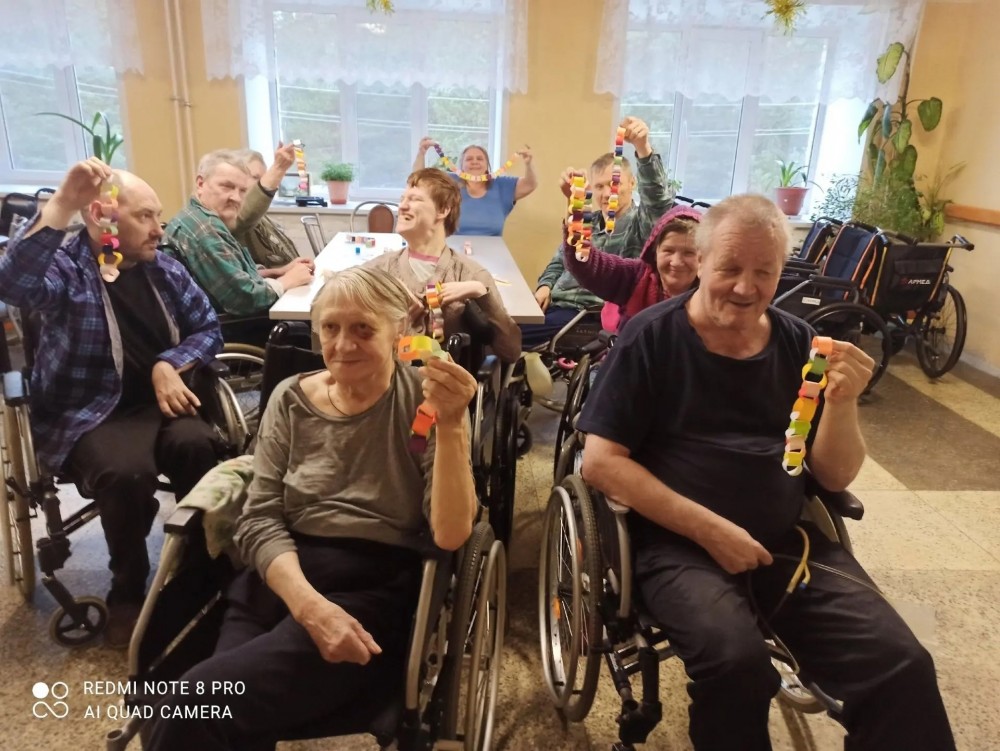 Занятие на отделении Милосердия не стало исключением. Тема занятия "Изготовление гирлянды на елку из цветной бумаги". Занятие не назовешь простым, но все активно включились в работу. Каждый выбирал сам цветовую гамму, правильно пользовался клеевым карандашом, приклеивая одно колечко к другому. За столом было шумно и весело, ведь все они одна команда, которая уже давно занимается вместе!!! Наши подопечные настолько увлеклись, что закончить занятие было не просто. После окончания занятия инструктор по труду Ильина В.Н. тепло поздравила всех с наступающим Новым годом и всем вручила небольшие подарки и сладости.