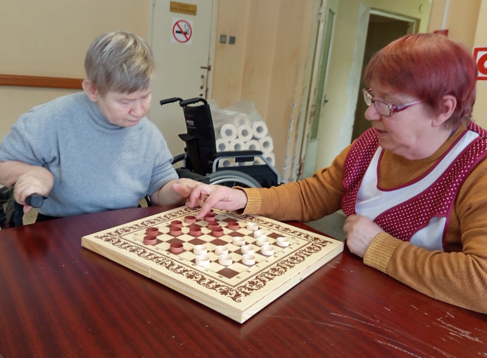 Сегодня на отделении «Милосердия» случился настоящий турнир! По просьбе наших проживающих мы устроили день игровой терапии — в ход пошли шашки, домино и любимое всеми лото.Самое трогательное событие этого дня — новичок в шашечном клубе! Алла Березина очень хотела научиться играть и с таким интересом ловила каждое слово инструктора Ильиной Валентины Николаевны, что результат не заставил себя ждать. Уже к концу занятия Алла порадовала нас своими первыми успехами! Но главное — это атмосфера. За столами было шумно, весело и по-домашнему тепло. Более опытные игроки с удовольствием подсказывали тем, кто только осваивает правила, и помогали друг другу. Вот она — настоящая командная игра!