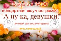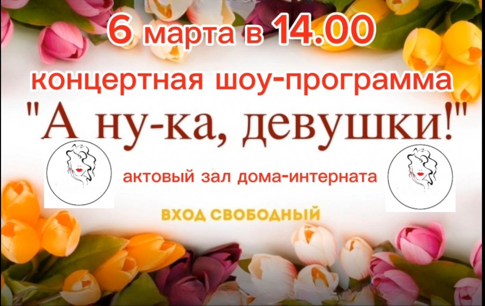 6 марта в 14:00 в актовом состоится праздничный конкурс«А НУ-КА, ДЕВУШКИ!»В конкурсе принимают участие наши проживающие в паре с сотрудниками дома-интерната. Приходите поддержать наших звёздочек! Ждём вас!