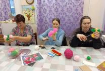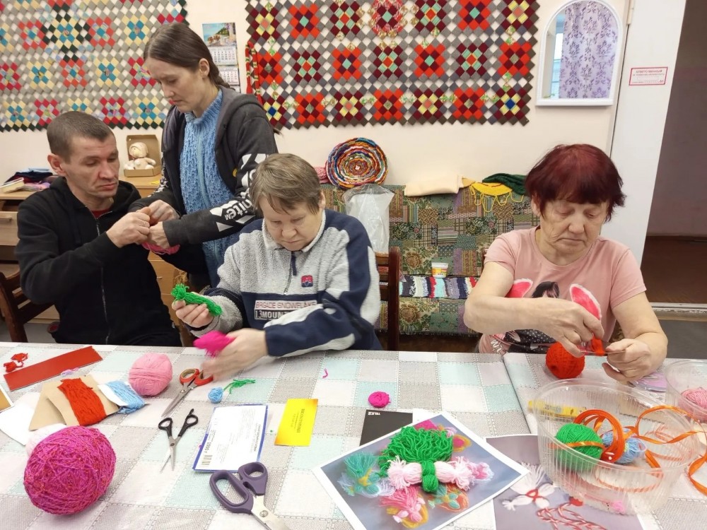 А главное — оживлённо и весело, ведь сегодня инструктор по труду Ильина Валентина Николаевна проводит для участников одно из любимых занятий — изготовление кукол из пряжи. Для работы были выбраны яркие цвета, и каждый выбирал цветовую гамму по своему усмотрению. В процессе работы все заметили, что из обычных клубочков пряжи, если очень постараться, получаются такие милые и яркие куколки! Все усердно и сосредоточенно включились в этот процесс и остались довольны результатом своего труда! Занятия по изготовлению кукол из пряжи способствуют развитию у людей с инвалидностью мелкой моторики, стимулируют мозговую активность и дают возможность для самореализации, а также корректируют и развивают воображение.