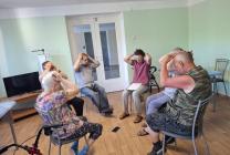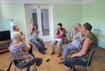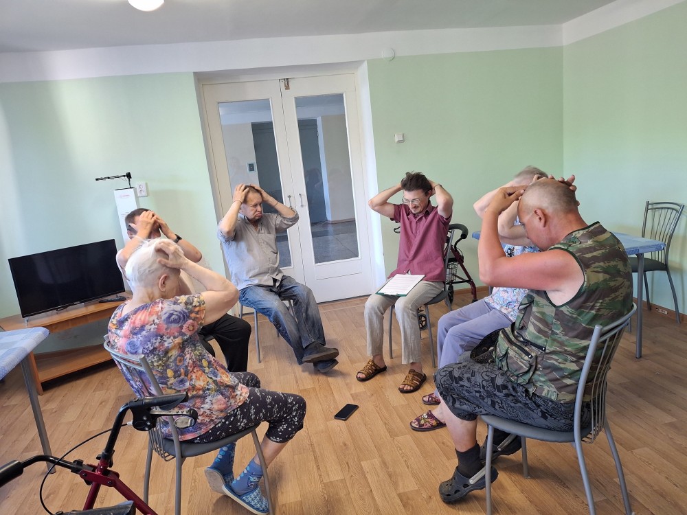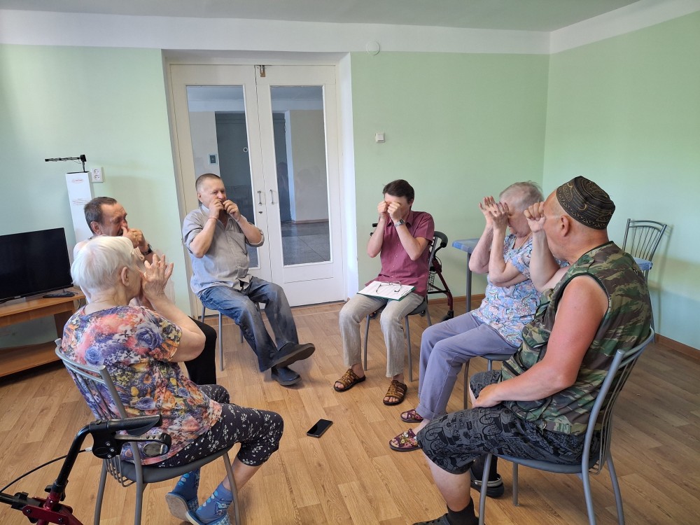 Занятия состоят из двух частей. Первая, «разминочная», включает в себя психогигиеническую гимнастику с элементами самомассажа, которая снимает напряжение и в то же время дает заряд бодрости. Эта гимнастика очень понравилась нашим участникам своей простотой и тем, что дает быстрый и заметный эффект. Во второй части участники делятся своими историями из жизни и размышлениями на заданную тему. Они обсуждают такие основополагающие и важные в пожилом возрасте предметы как счастливые воспоминания, надежда, доверие – то, что связывает обычных людей друг с другом.
