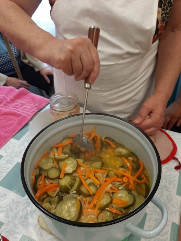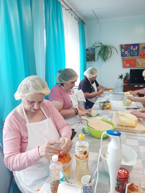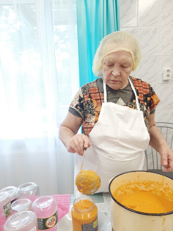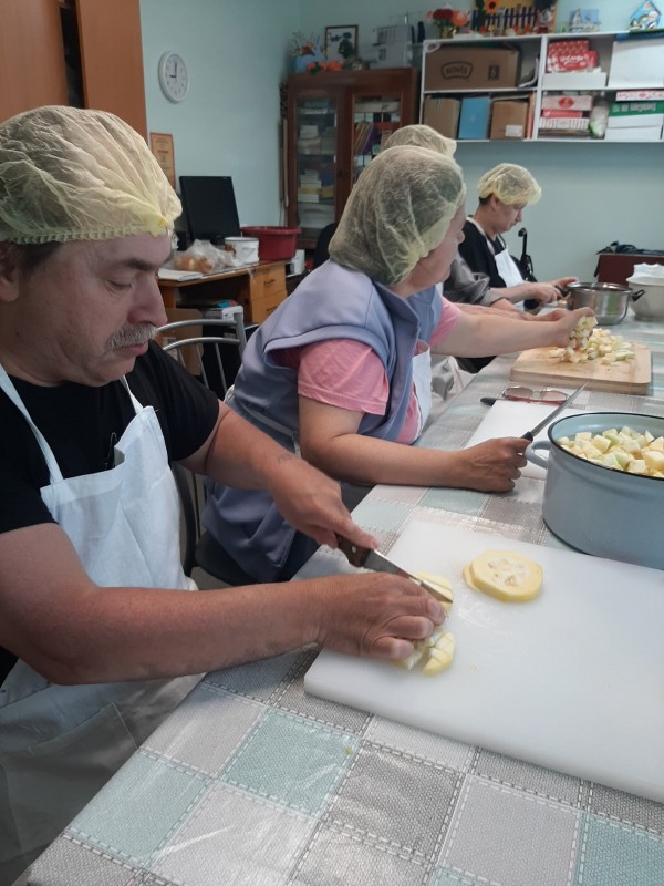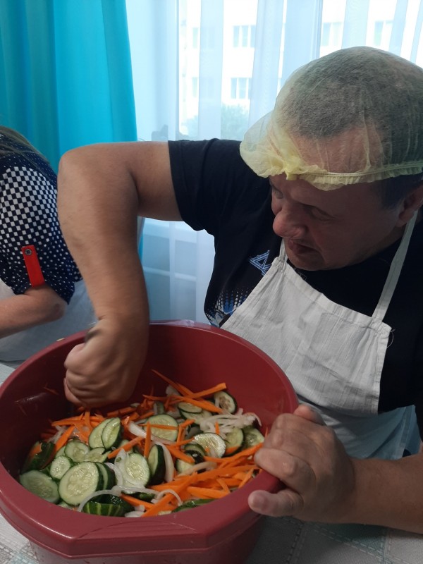 Под руководством инструктора по труду, Зинкуевой Нины Викторовны, наши подопечные с большим энтузиазмом нарезали, тушили и солили. В результате мы приготовили вкуснейшую кабачковую икру и салат из огурцов на зиму. Теперь все это аккуратно стоит в баночках и ждет своих выходов на зимний стол.