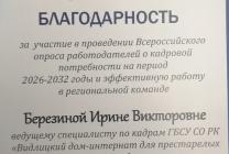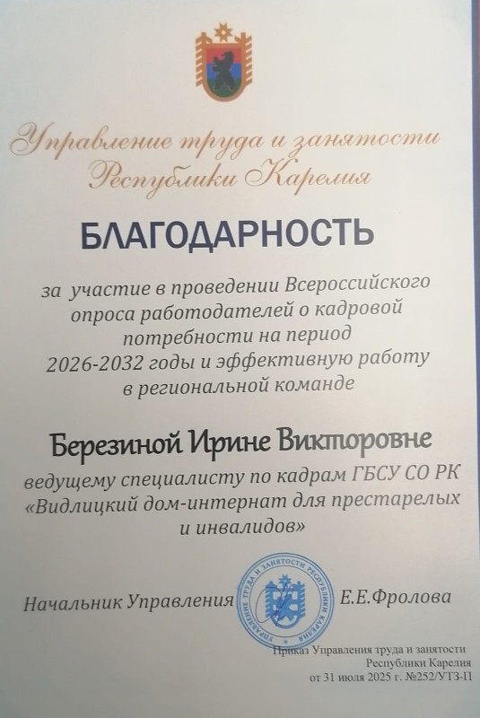 За участие в проведении Всероссийского опроса работодателей о кадровой потребности на период 2026-2032 годы и эффективную работу в региональной команде ведущему специалисту по кадрамБЕРЕЗИНОЙ ИРИНЕ ВИКТОРОВНЕ была вынесена благодарность от Управления труда и занятости Республики Карелия!