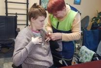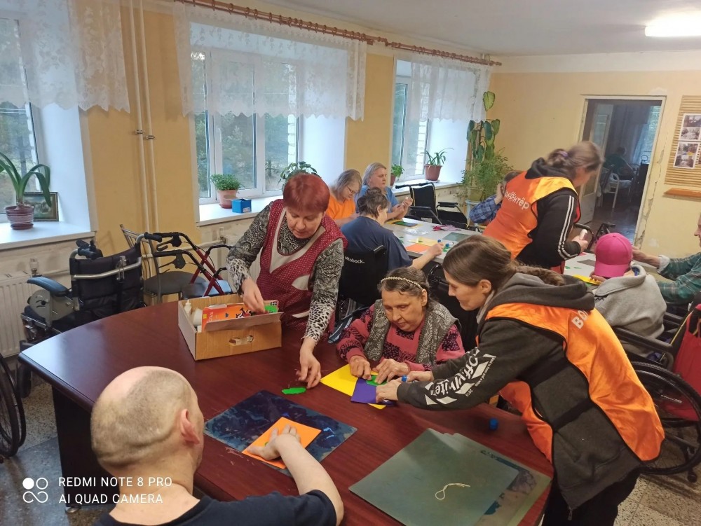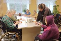 Занятие на отделении Милосердия не стало исключением. Тема занятия "Изготовление гирлянды на елку из цветной бумаги". Занятие не назовешь простым, но все активно включились в работу. Каждый выбирал сам цветовую гамму, правильно пользовался клеевым карандашом, приклеивая одно колечко к другому. За столом было шумно и весело, ведь все они одна команда, которая уже давно занимается вместе!!! Наши подопечные настолько увлеклись, что закончить занятие было не просто. После окончания занятия инструктор по труду Ильина В.Н. тепло поздравила всех с наступающим Новым годом и всем вручила небольшие подарки и сладости.