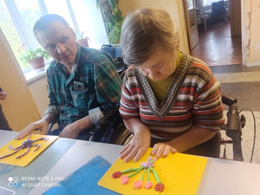 Инструктор по труду Ильина Валентина Николаевна провела увлекательное и полезное занятие по лепке из пластилина. На столах расцвели диковинные цветы и появились забавные осьминожки, а самое главное — на занятии царили радость и улыбки наших подопечных.Такие занятия — это не просто веселое времяпрепровождение. Чем же полезна пластилинолепие для людей с инвалидностью?· Развитие моторики: Работа с мягким пластилином прекрасно тренирует мелкую моторику рук, силу и ловкость пальцев, что очень важно для поддержания двигательных функций.