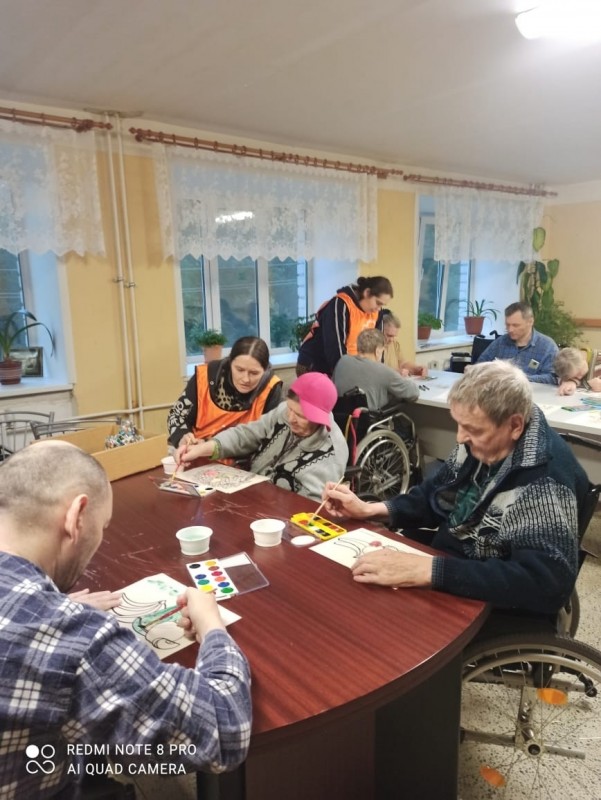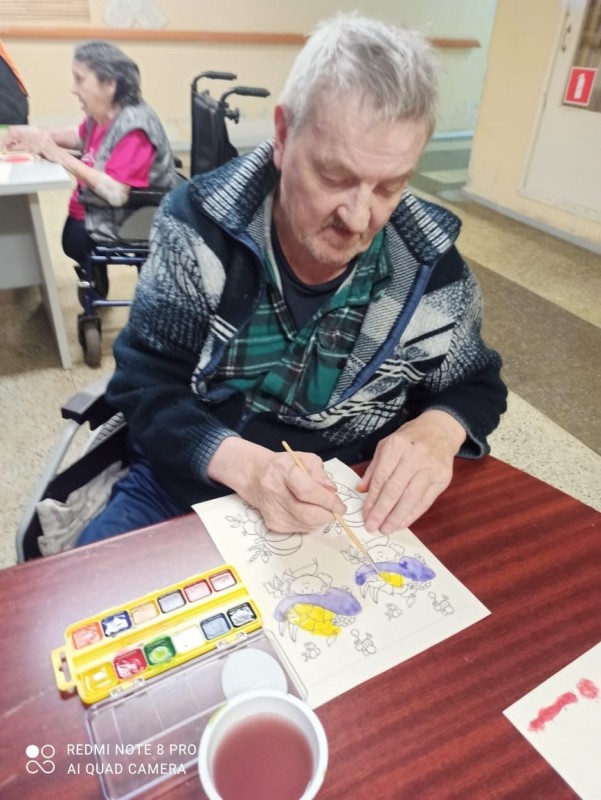 Мы достали раскраски, и каждый наш подопечный выбрал себе картинку по душе. Перед тем как взять в руки карандаши и кисти, мы немного потренировали внимание: каждый называл вслух цвета, которые планировал использовать. А потом началось самое интересное — процесс творчества! Кто-то с удовольствием взялся за цветные карандаши, кому-то больше по душе пришлись яркие фломастеры, а некоторые решили создать свои шедевры красками. Выбор материалов — тоже важная часть терапии, которая учитывает возможности и желание каждого. Работали с большим увлечением и сосредоточенностью, ведь так давно мы не раскрашивали! Итогом нашего занятия стал обновленный стенд с работами. Он теперь пестрит красками и добрыми сюжетами. Обязательно приходите полюбоваться!