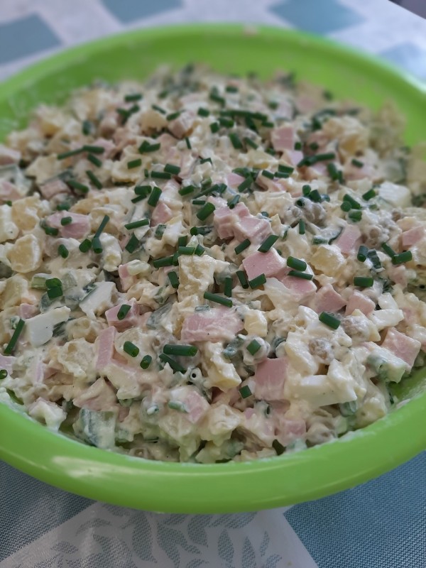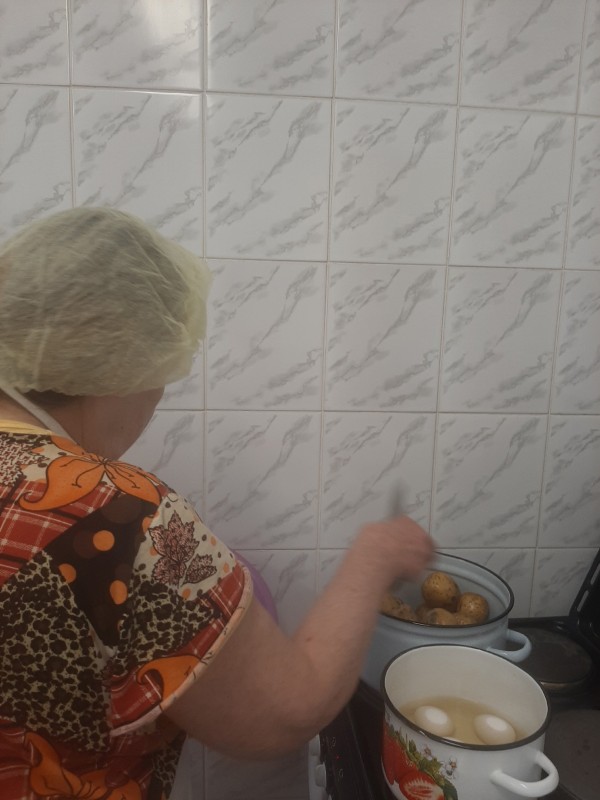 Сварили овощи и яйца на салат, аккуратно все ингредиенты нарезали кубиком. Взбили миксером сливочное масло, сахарный песок, яйца для теста на пирог. В работе использовали миксер, духовку, электрическую плиту.