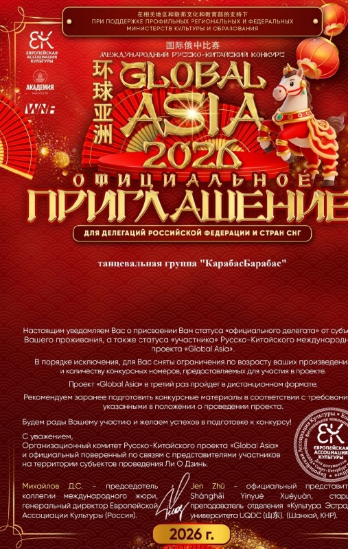 Танцевальной группе "КарабасБарабас" официально присвоили статус "официального делегата" от субъекта Нашего проживания, а так же статуса "участника" Русско-Китайского международного проекта "Giobal Asia"