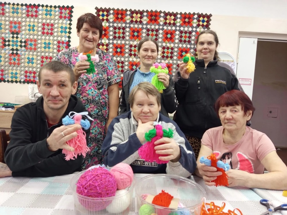 А главное — оживлённо и весело, ведь сегодня инструктор по труду Ильина Валентина Николаевна проводит для участников одно из любимых занятий — изготовление кукол из пряжи. Для работы были выбраны яркие цвета, и каждый выбирал цветовую гамму по своему усмотрению. В процессе работы все заметили, что из обычных клубочков пряжи, если очень постараться, получаются такие милые и яркие куколки! Все усердно и сосредоточенно включились в этот процесс и остались довольны результатом своего труда! Занятия по изготовлению кукол из пряжи способствуют развитию у людей с инвалидностью мелкой моторики, стимулируют мозговую активность и дают возможность для самореализации, а также корректируют и развивают воображение.